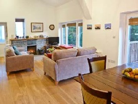 Upstairs contains the main accommodation, with an open plan lounge/ dining room/ kitchen, the main bedroom, a bunk bedroom and main bathroom. The lounge has two sofas, an open fireplace with new oak flooring, mantelpiece and window seat, a 40” television with freesat & HDD, DVD player and hi-fi. It has a dining area with French windows which open out onto the large balcony (with a 6-seater patio set) overlooking the garden. The kitchen is well-equipped with a double oven, hob, microwave and fridge. The bathroom has a shower/bath, WC and wash basin. The main bedroom has a double bed and a full size single bed. The bunk bedroom has two full size bunks.